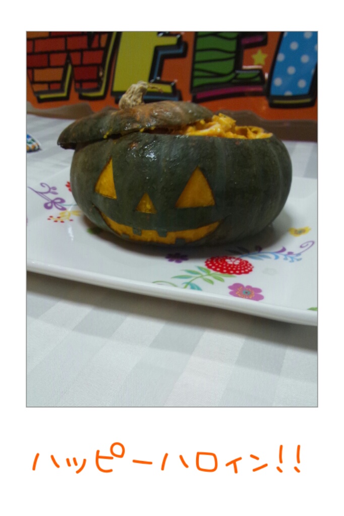 ちょっと前になりますが、お友達の家でハロウィンパーティーをしてきました。その時のかぼちゃがあまりにもかわいくて、思わず写メ。中身はサラダでした。